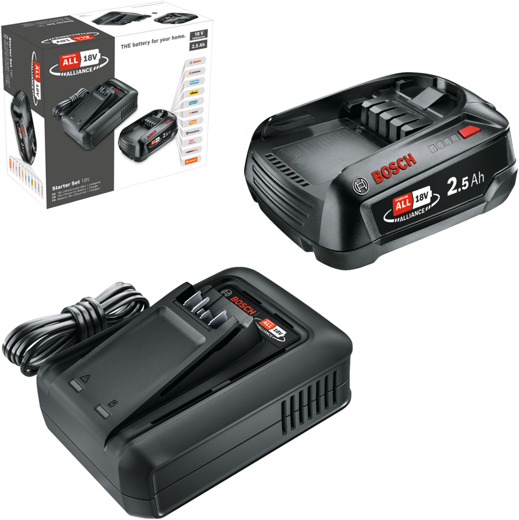 Dette startsettet passer for alle Bosch Home & Garden-verktøy med 18 V spenning. Settet inkluderer et kraftig litium-ion-batteri med lang brukstid og pålitelig ytelse. Den medfølgende laderen har en "ready-to-go" indikator, som lyser grønt ved 80% og signaliserer at batteriet er klart til bruk.