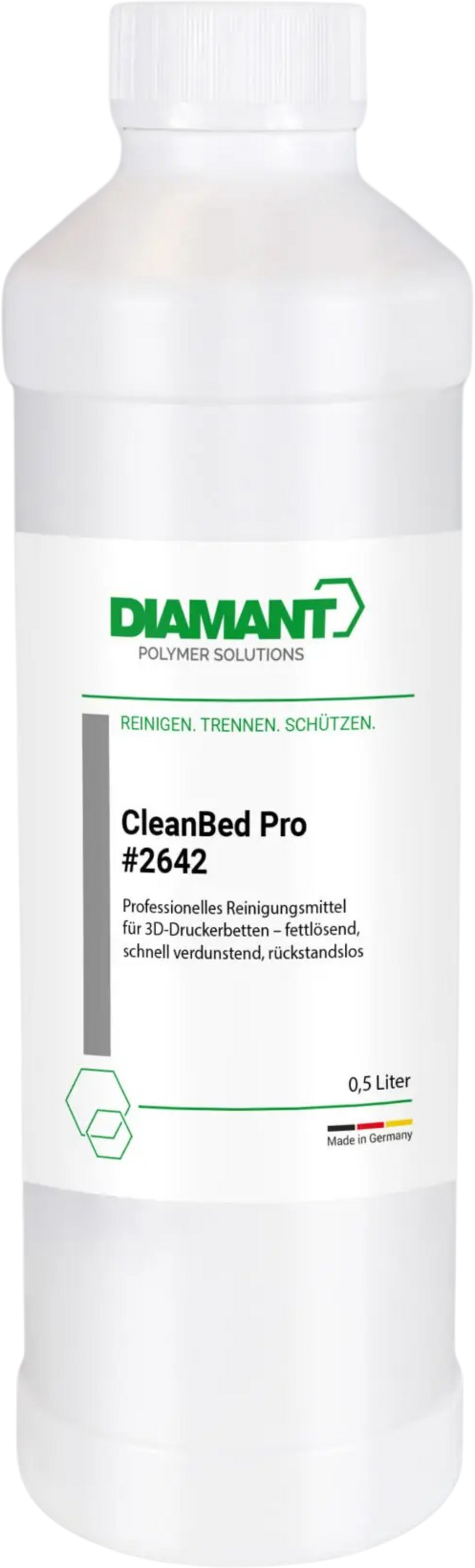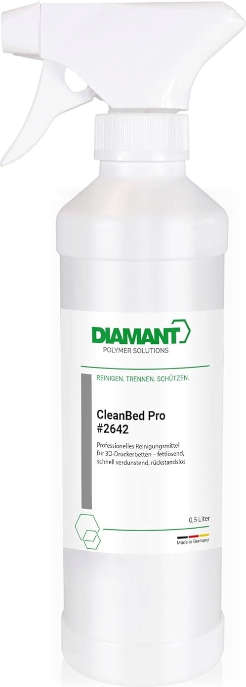 Diamant Polymer CleanBed Pro er den pålitelige løsningen for rengjøring av 3D-printerens byggeflatesoverflater. Med sin høyrensede isopropanol-formel (99 %) fjerner den effektivt limrester, støv, hudfett og andre rester – helt uten aggressive tilsetninger, duftstoffer eller vann. Resultatet: en absolutt ren overflate som sørger for optimal vedheft under utskriften!