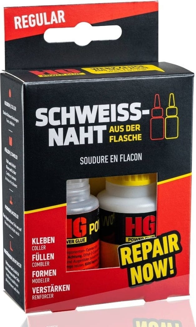 HG Power Glue Sveisefuge fra flasken Regular er et kraftig 2-komponents klebesystem bestående av granulater og lim, designet for spesielt sterke og robuste forbindelser. Det er ideelt for reparasjoner der vanlig hurtiglim når sine begrensninger.