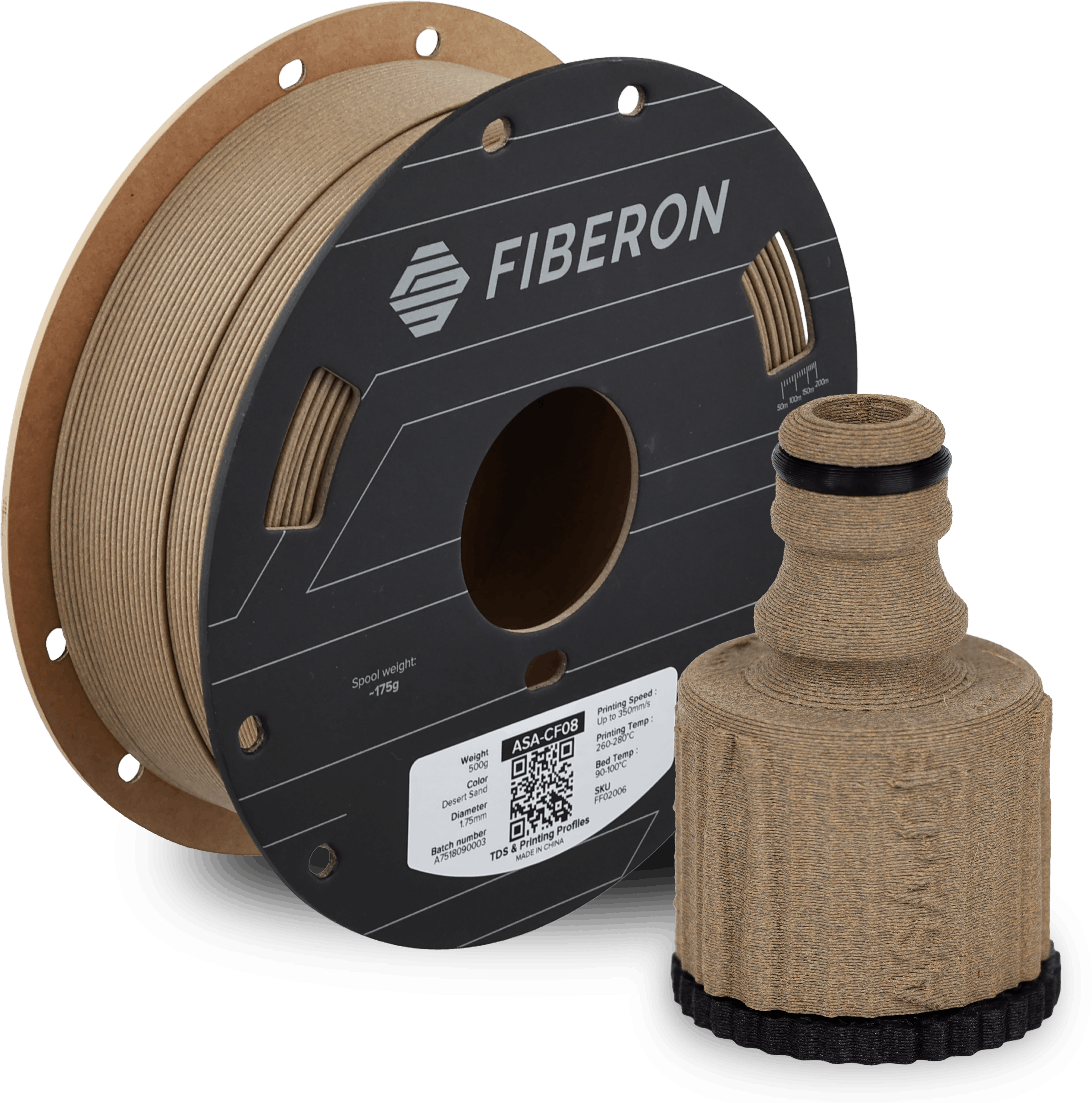 Fiberon™ ASA-CF08 er et høytytende filament basert på Acrylnitril-Statyren-Akrylat (ASA), forsterket med 8 % karbonfibre. Resultatet er et materiale med bemerkelsesverdig stivhet, høy dimensjonsnøyaktighet og en matt, lett overflate, som utmerker seg både ved sine mekaniske egenskaper og estetiske kvalitet.