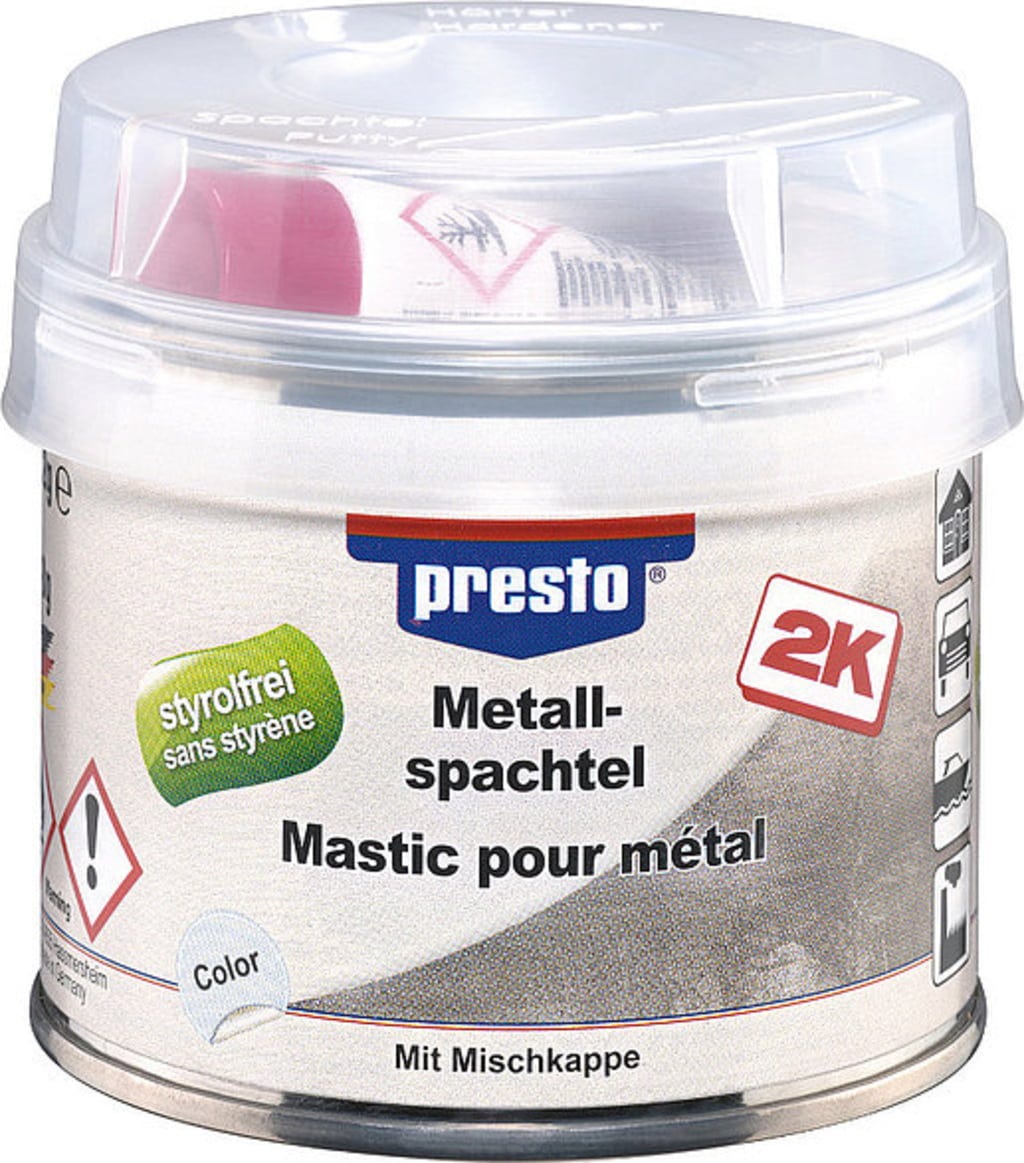 presto metallsparkel er en to-komponent polyestermetallsparkel med spesielle fyllstoffer og aluminiumspigmenter, ideell for større reparasjonsarbeider. Den høye tiksotropien gjør det mulig å påføre materialet jevnt, porfritt og i variabel lagtykkelse.