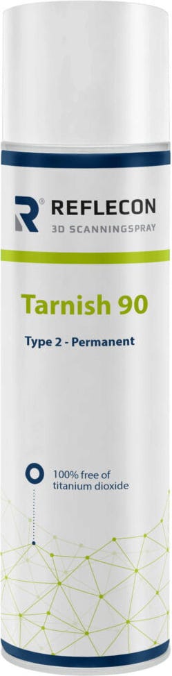 Reflecon Tarnish 90 Scanningspray er et høykvalitets matteringsmiddel for optiske 3D-skanneapplikasjoner og er karakterisert ved en spesielt fin, lukket og jevn hvit overflate. Belegget sørger for optimal skanning på egnede materialer.