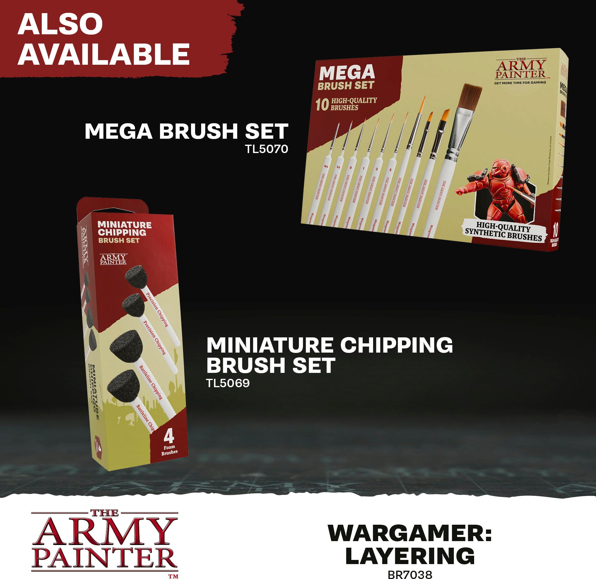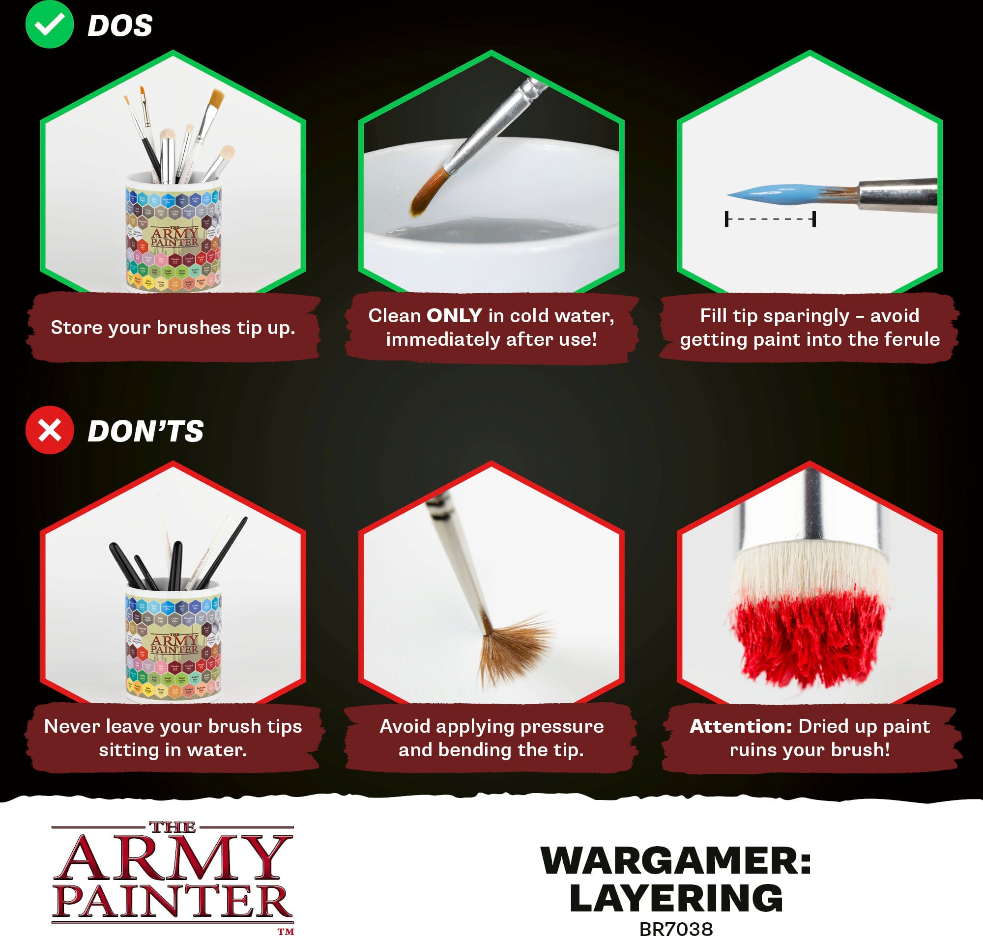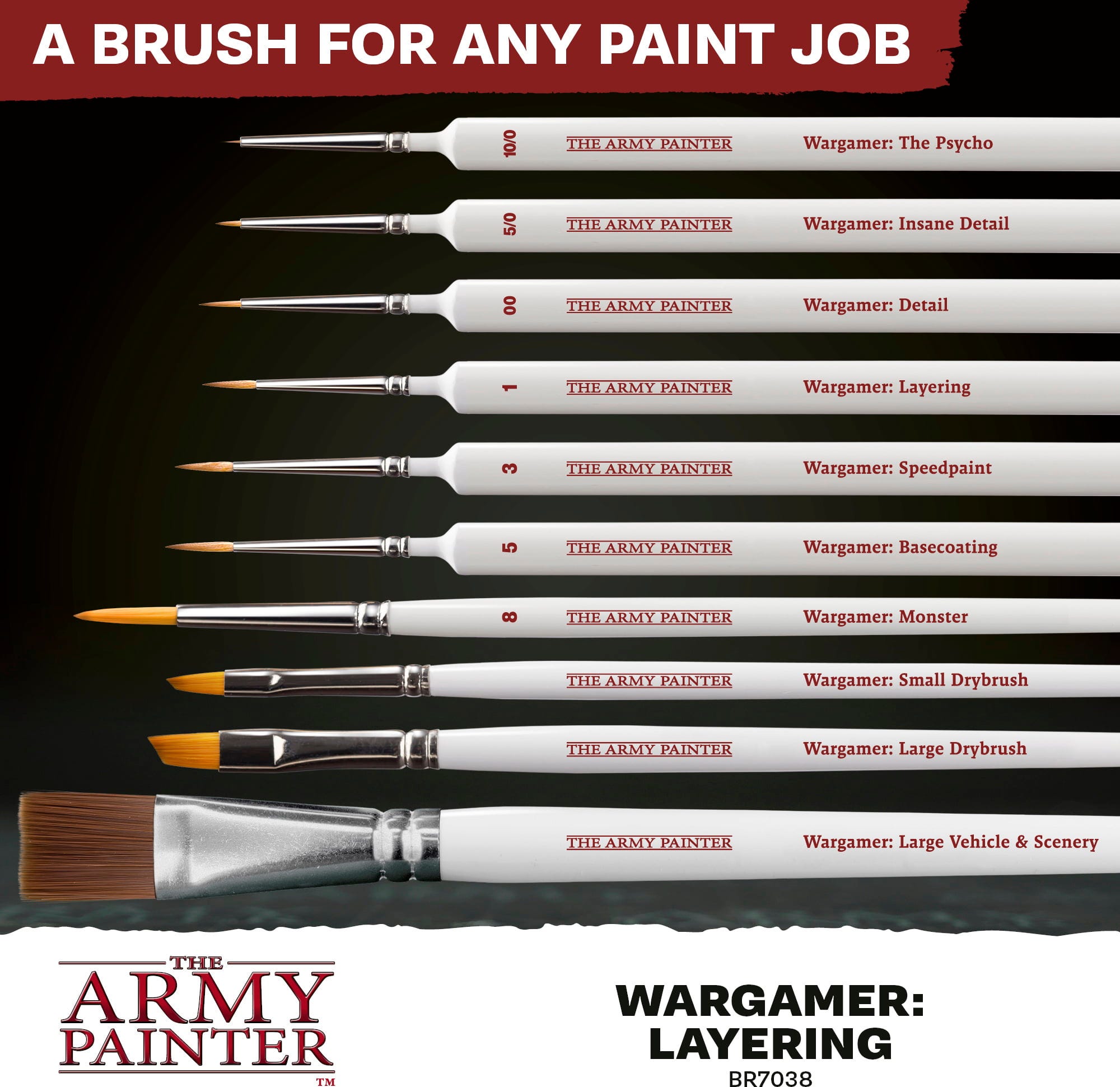 Wargamer Brushes fra The Army Painter setter standarden innen miniatyrmaling. Takket være den innovative Bionic Bristle-teknologien med syntetiske fibre, er disse penslene spesielt tilpasset moderne maleteknikker som Speedpaint og One-Coat-applikasjoner.